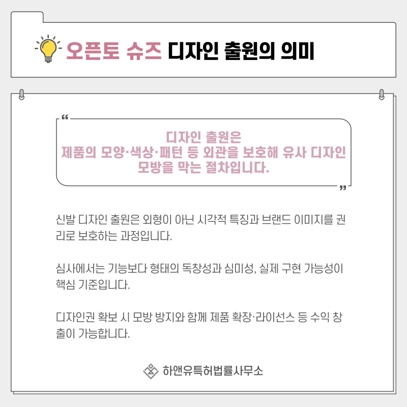 특히 신발은 외형 자체가 제품 경쟁력이기 때문에 디자인권은 사실상 시장 진입 장벽 역할을 합니다.
