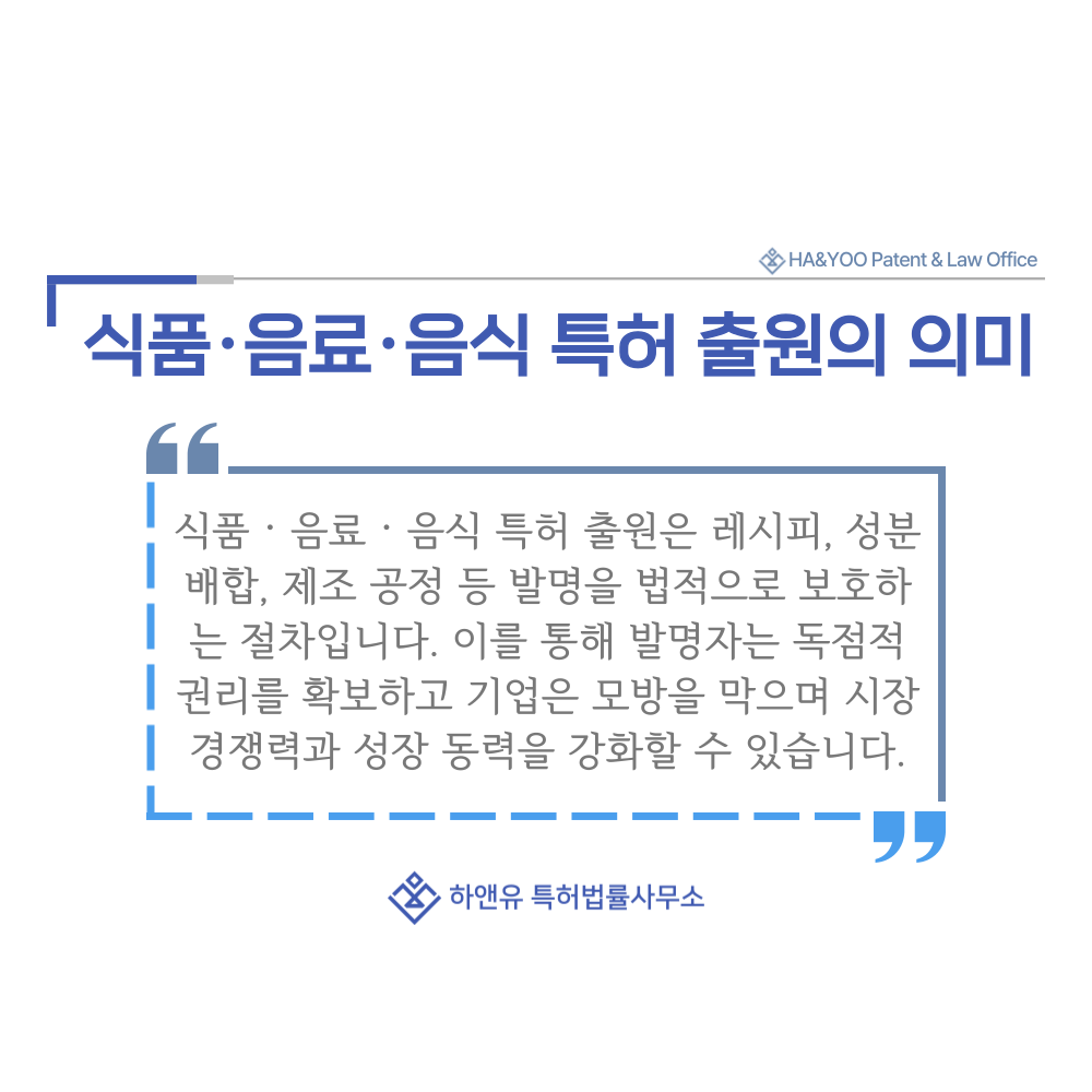 식품·음료·음식 특허 출원이란 새로운 레시피, 성분 배합, 제조 공정, 저장 및 가공 기술과 같은 발명을 특허청에 신청해 법적으로 권리화하는 절차입니다.
