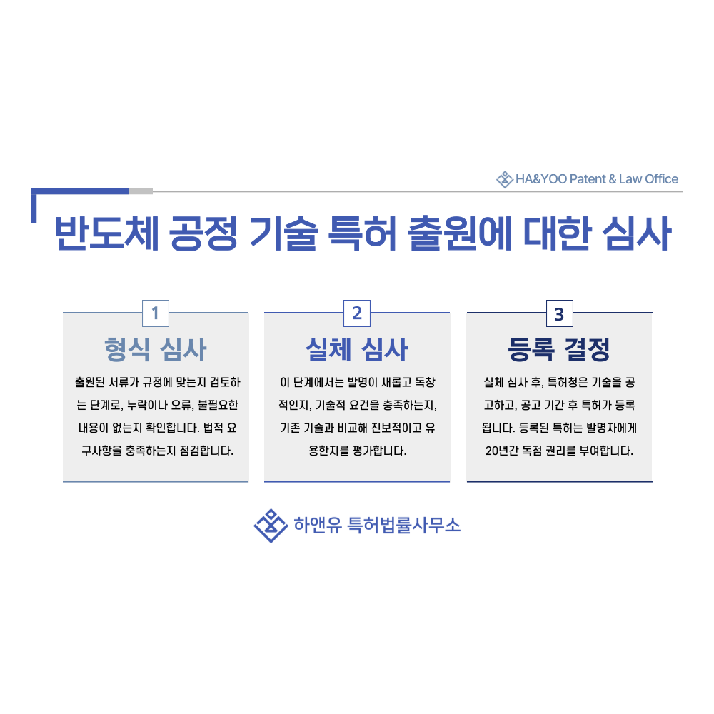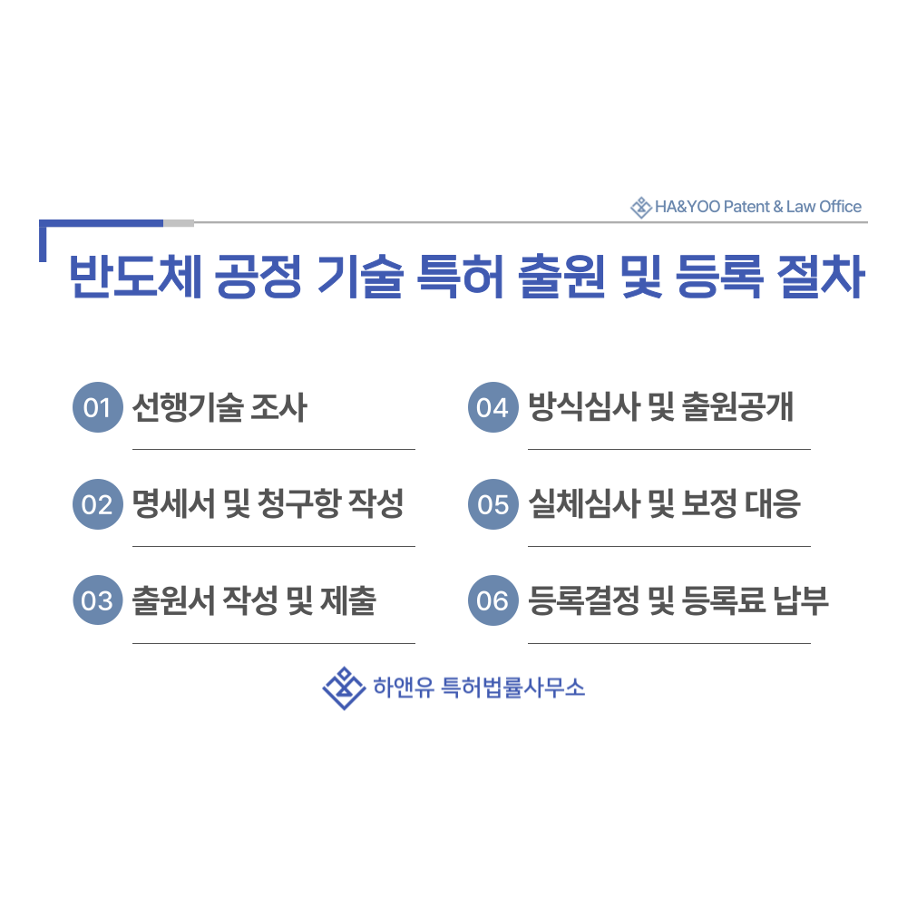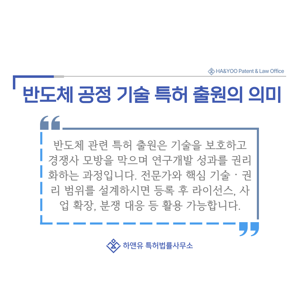 #반도체공정기술 #실리콘 #화합물 #웨이퍼 #기판 #포토레지스트 #포토마스크 #세정액 #전구체 #도핑소스 #특허 #특허출원 #특허등록 #특허권 #하앤유 #특허변리사 #PatentRegistration #PatentApplication