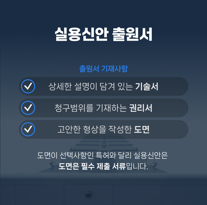 도면이 선택사항인 특허와 달리 실용신안은 도면을 필수 제출 서류입니다.