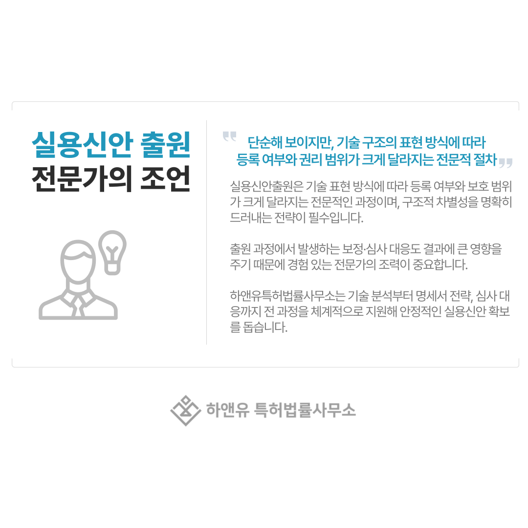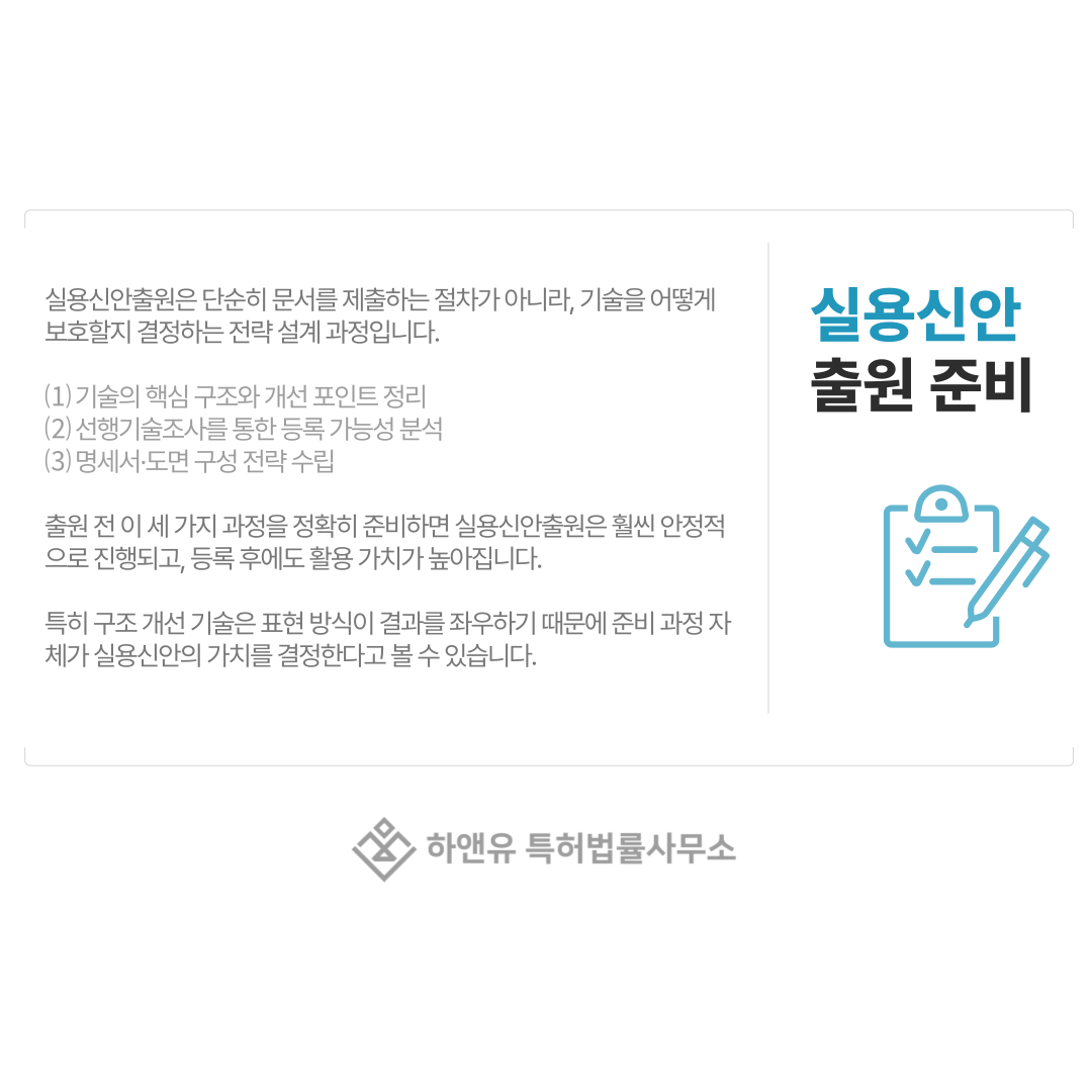 특히 구조 개선 기술은 표현 방식이 결과를 좌우하기 때문에 준비 과정 자체가 실용신안의 가치를 결정한다고 볼 수 있습니다.