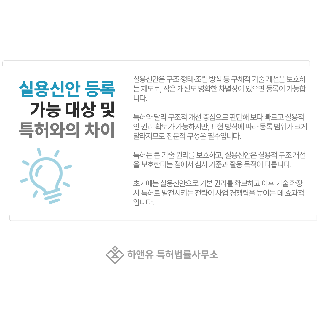 반면 실용신안은 기술적 효과를 주는 구조적 개선을 중심으로 판단하기 때문에 보다 빠르고 실용적인 권리 확보가 가능합니다.