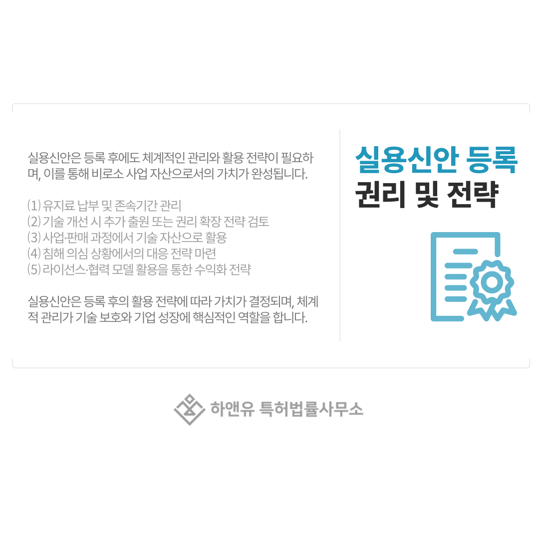 등록 이후에는 유지료 납부가 필요하며, 기술이 확장되는 경우 추가 실용신안이나 특허 출원으로 권리 범위를 확장할 수 있습니다.