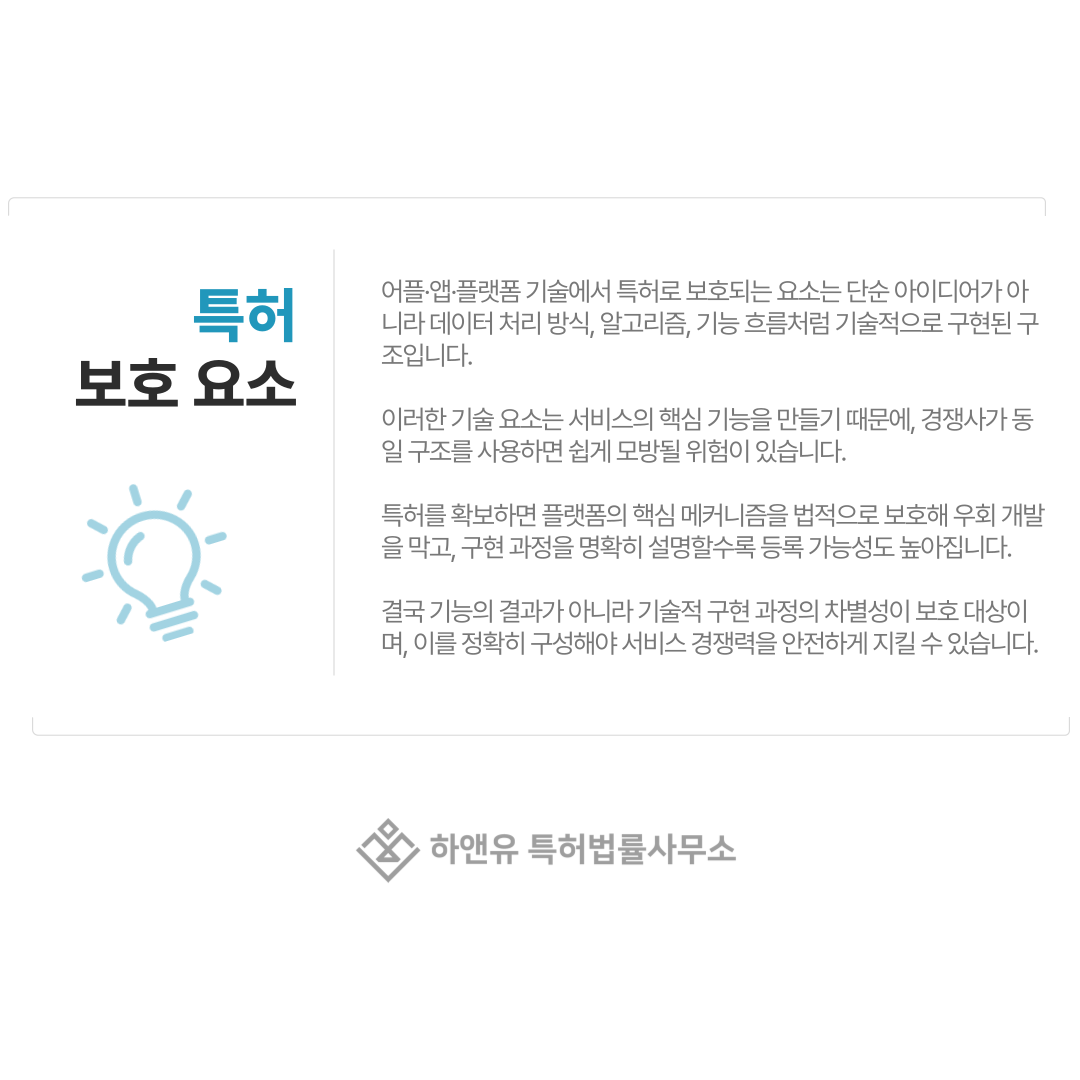 또한 어플·앱·플랫폼 기술은 단순 아이디어가 아니라 데이터 처리 방식, 기능 흐름, 알고리즘 구조처럼 기술적 차별성이 존재할 때 특허로 보호받을 수 있습니다.