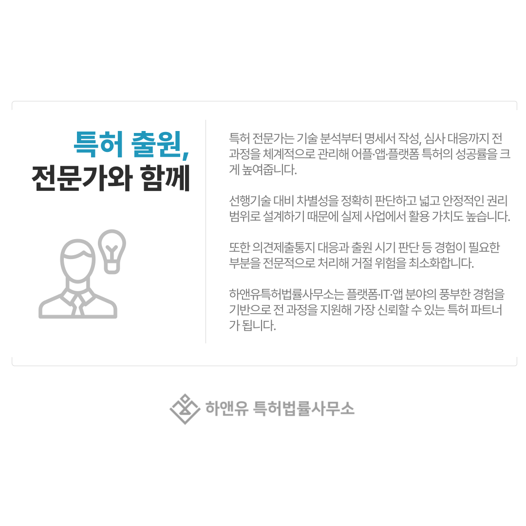 하앤유특허법률사무소는 어플·앱·플랫폼 특허를 준비하는 기업에게 가장 신뢰할 수 있는 파트너가 될 것입니다.
