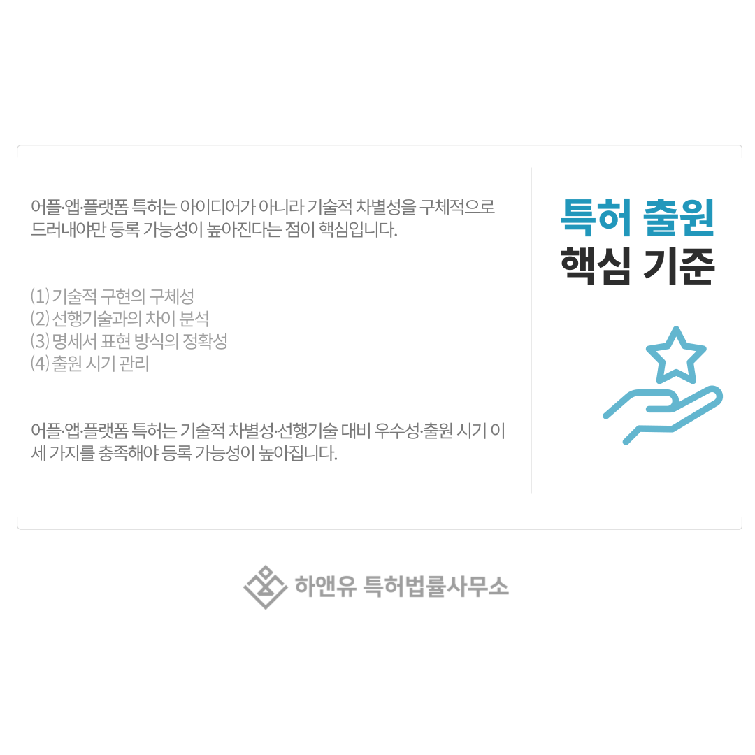 결국 어플·앱·플랫폼 특허는 기술적 차별성을 정확히 표현하고, 선행기술 대비 우수성을 논리적으로 설명하며, 적절한 시기에 출원해야 등록 가능성이 높아집니다.