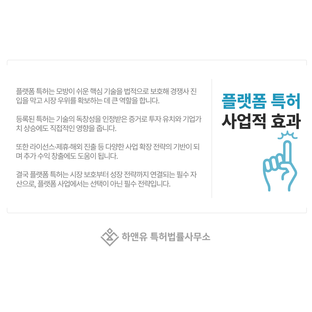 결국 플랫폼 특허는 단순히 등록으로 끝나는 권리가 아니라, 시장 보호·경쟁력 확보·투자 유치·해외 확장·수익 모델 강화까지 이어지는 핵심 자산입니다.