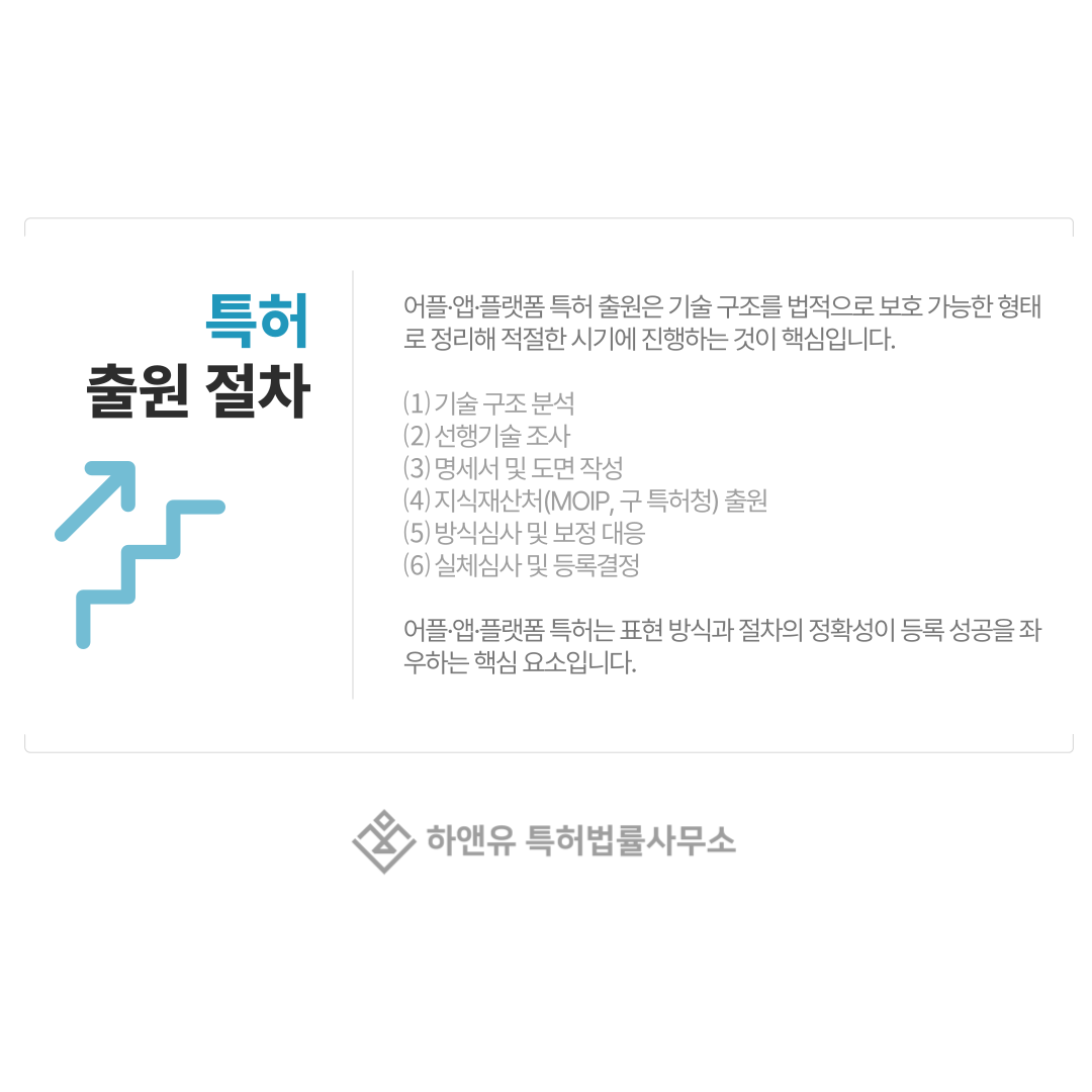 어플·앱·플랫폼 특허는 기술 구조가 복잡하고 표현 방식에 따라 결과가 달라지기 때문에, 각 절차를 정확하게 진행하는 것이 안정적인 등록의 핵심입니다.