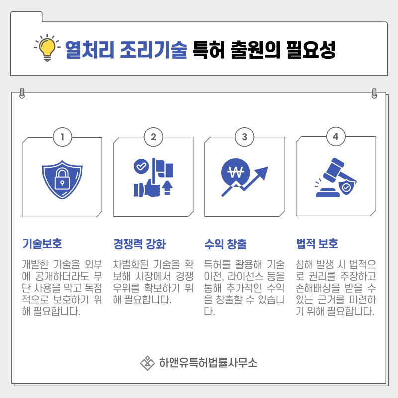 이러한 기술을 특허로 확보하면 유사 조리 방식이나 제품의 모방을 효과적으로 방지할 수 있습니다.