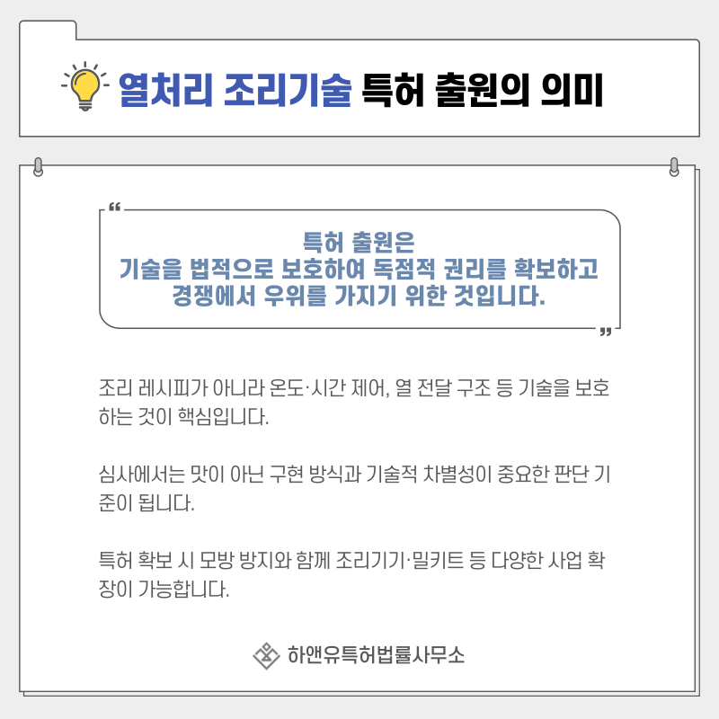 단순한 레시피 보호가 아니라 조리 방식과 열 전달 구조, 공정 제어 기술을 권리화하는 과정입니다.