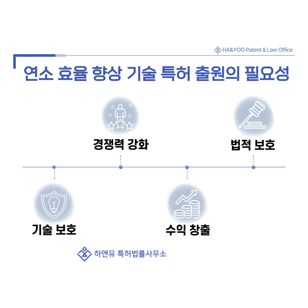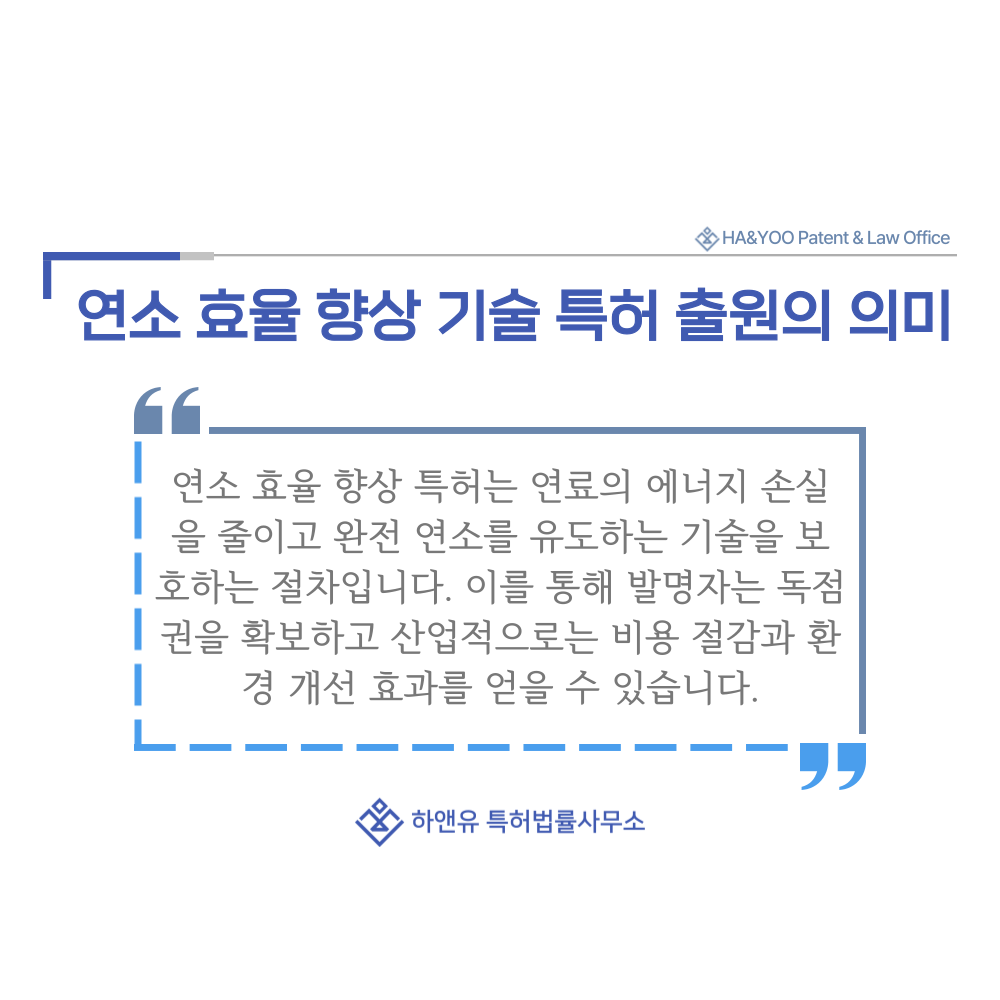 특허는 단순한 기술의 보유를 넘어 기업의 시장 경쟁력을 높이는 중요한 수단이 됩니다. 연소 효율 향상 기술을 특허화하면 경쟁사가 동일한 방법을 사용할 수 없으므로, 시장에서 독자적인 위치를 확보할 수 있습니다. 특히 에너지와 환경 규제가 강화되는 시대에 해당 기술을 특허로 보호한다는 것은 곧 기업 신뢰도와 브랜드 가치를 높이는 요소가 됩니다.