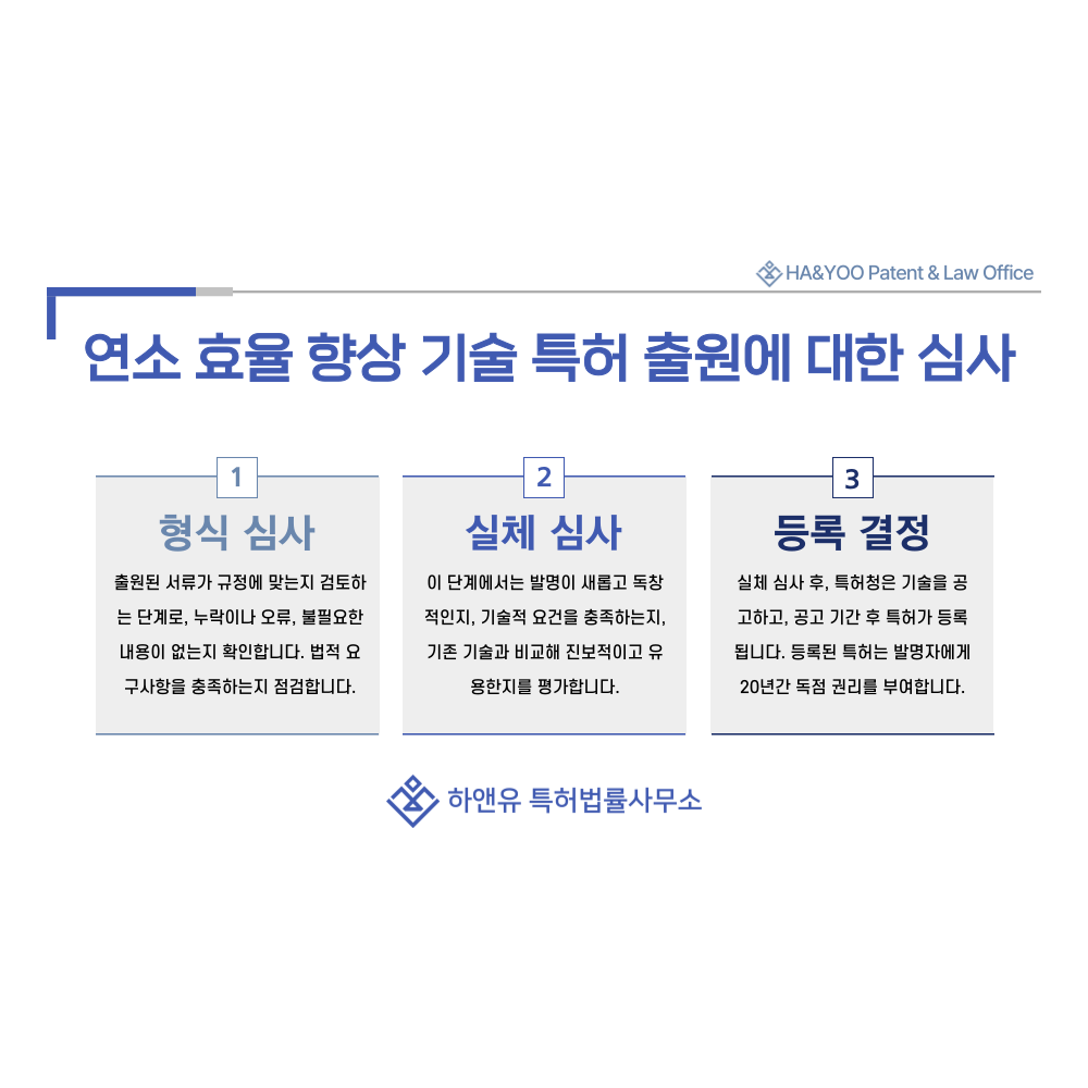 이러한 특허를 통해 발명자는 독점적인 권리를 보장받아 기술을 상업화할 수 있으며, 산업적으로는 연료비 절감, 온실가스 저감, 설비 수명 연장 같은 효과를 기대할 수 있습니다. 따라서 연소 효율 향상 기술 특허 출원은 에너지 절약과 친환경 산업 전환을 동시에 실현하는 중요한 절차라 할 수 있습니다.