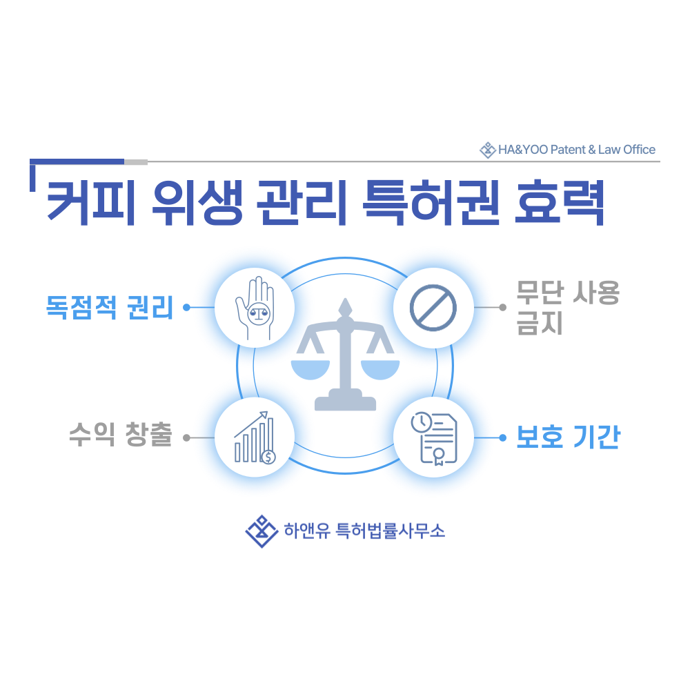원두 스쿱, 버큠 컨테이너, 스케일 제거제, 세정제, 그라인더 브러쉬 관련 기술이 특허로 등록되면 발명자는 그 기술을 독점적으로 사용할 수 있는 권리를 가집니다.