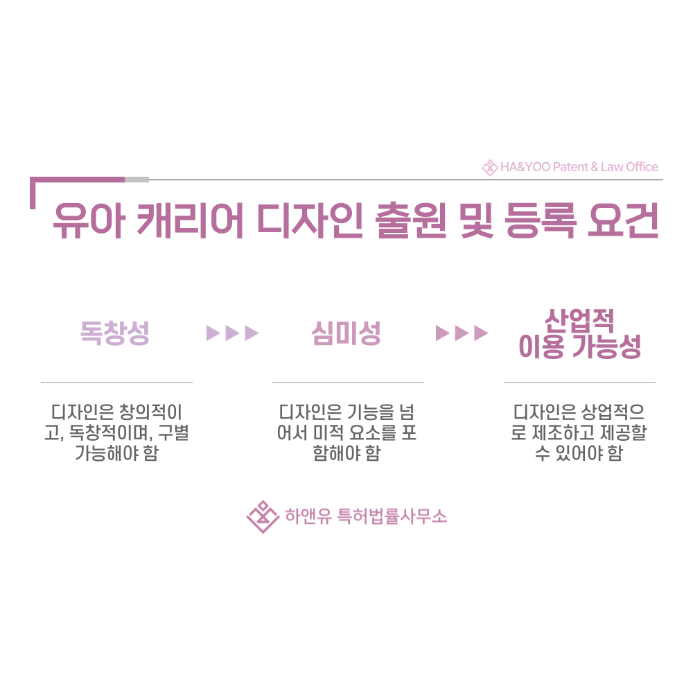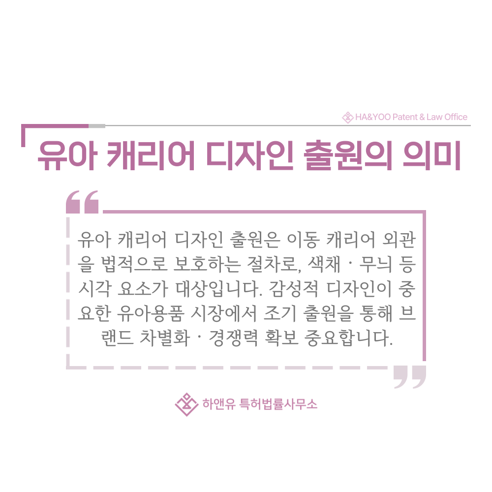 따라서 유아 캐리어 디자인 등록은 제품의 창의성과 브랜드 가치를 안정적으로 지켜주는 가장 확실한 법적 수단입니다.