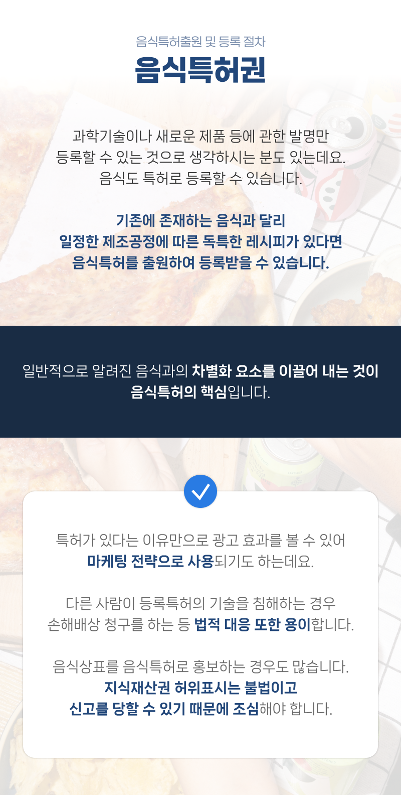 지식재산권에 대한 이해도가 부족 또는, 허위표시로 인한 특허권의 이득을 취하려는 의도 등으로 음식상표를 음식특허로 홍보하는 경우도 많습니다.