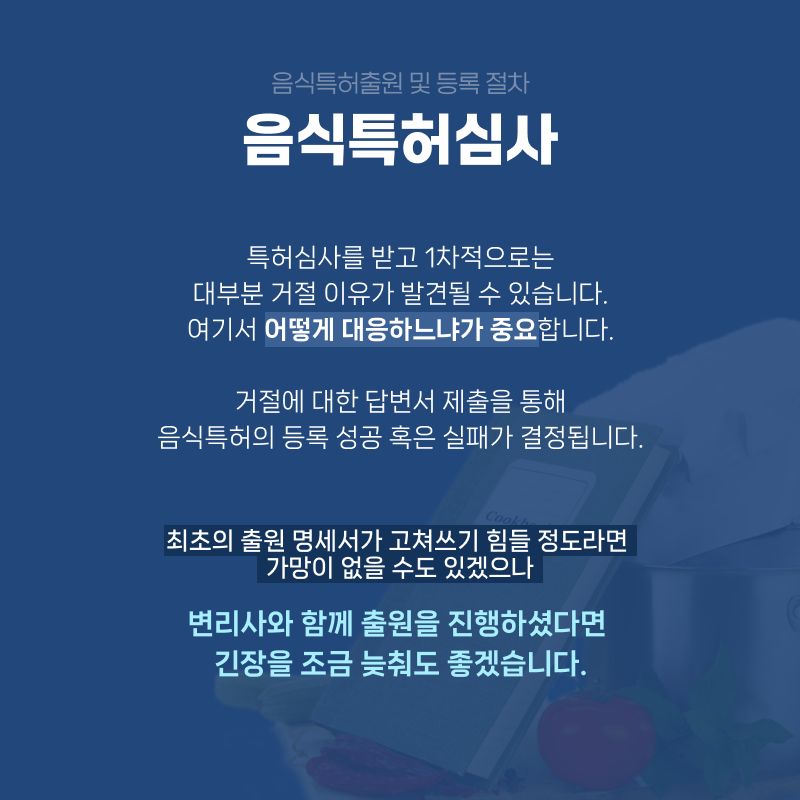 거절에 대한 답변서 제출을 통해 음식특허의 등록 성공 혹은 실패가 결정됩니다.