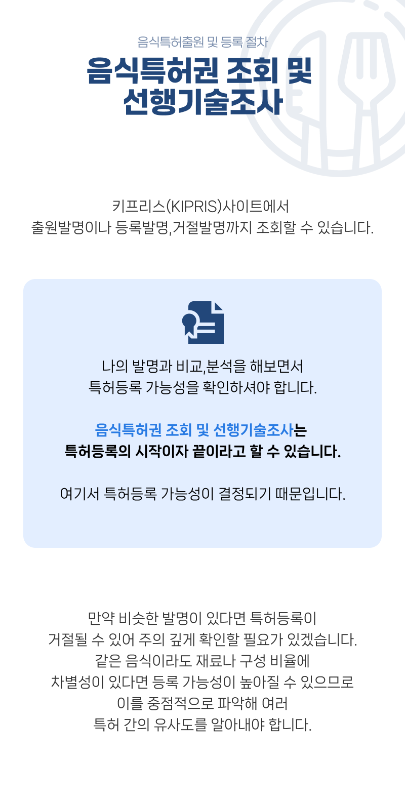여기서 특허등록 가능성이 결정되기 때문에 음식특허권 조회 및 선행기술조사는 특허등록의 시작이자 끝이라고 할 수 있습니다.