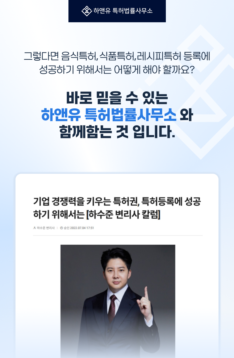 ▼ 음식특허/식품특허/레시피특허 하앤유 특허법률사무소에서 무료 검토 받기 CLICK!! ▼