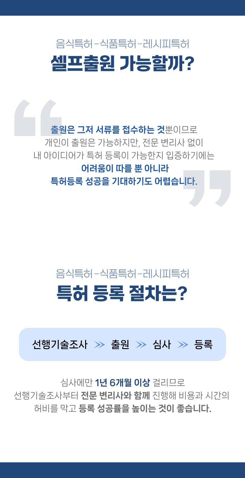 음식특허를 원하신다면 변리사 선임으로 등록에 꼭 성공할 수 있는 출원 서류를 작성하시길 바랍니다.