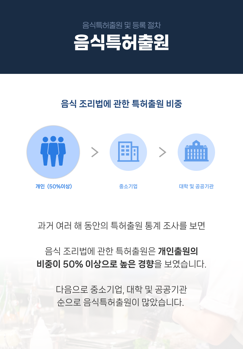 과거 여러 해 동안의 특허출원 통계 조사를 보면 음식 조리법에 관한 특허출원은 개인출원의 비중이 50% 이상으로 높은 경향을 보였습니다.