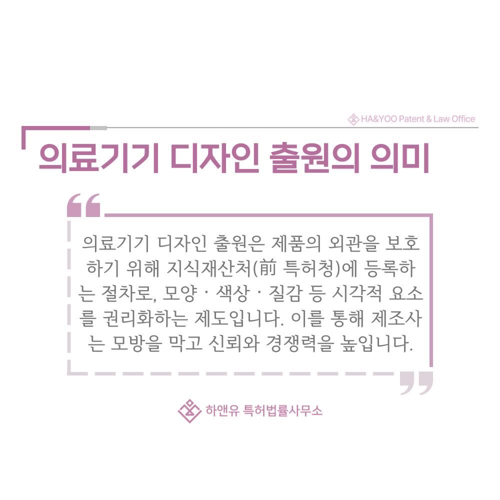 이를 통해 의료기기 제조사는 모방 제품을 법적으로 방지하고, 기술력뿐 아니라 디자인 경쟁력까지 확보할 수 있습니다.