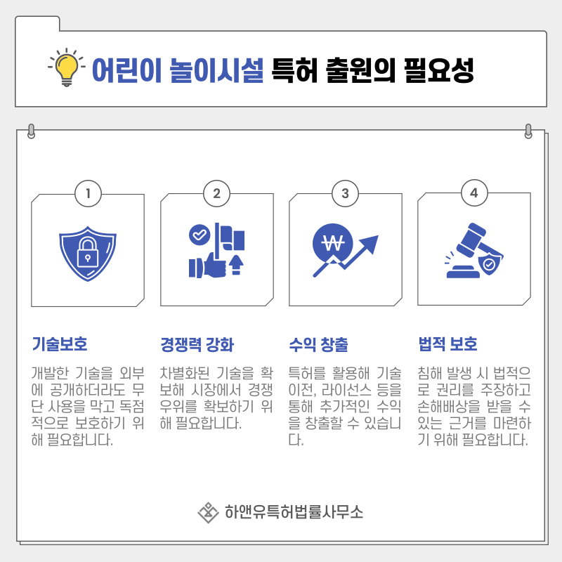 특히 놀이시설은 설치형 제품 특성상 한 번 시장에 퍼지면 빠르게 확산되기 때문에 사전 권리 확보가 중요합니다.
