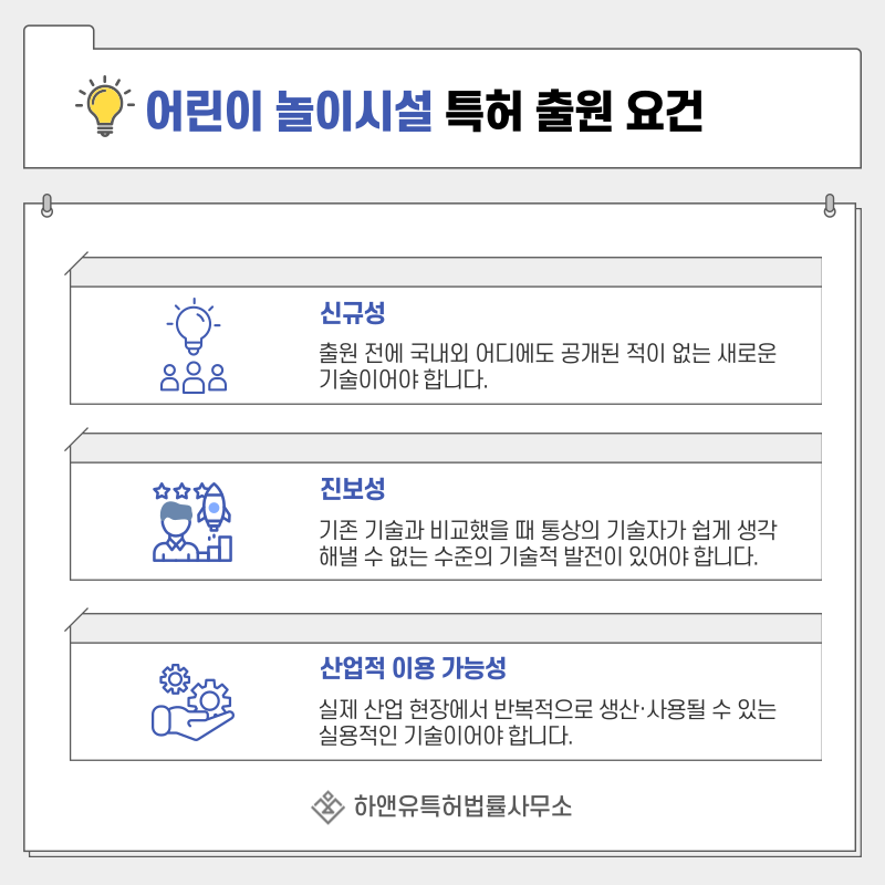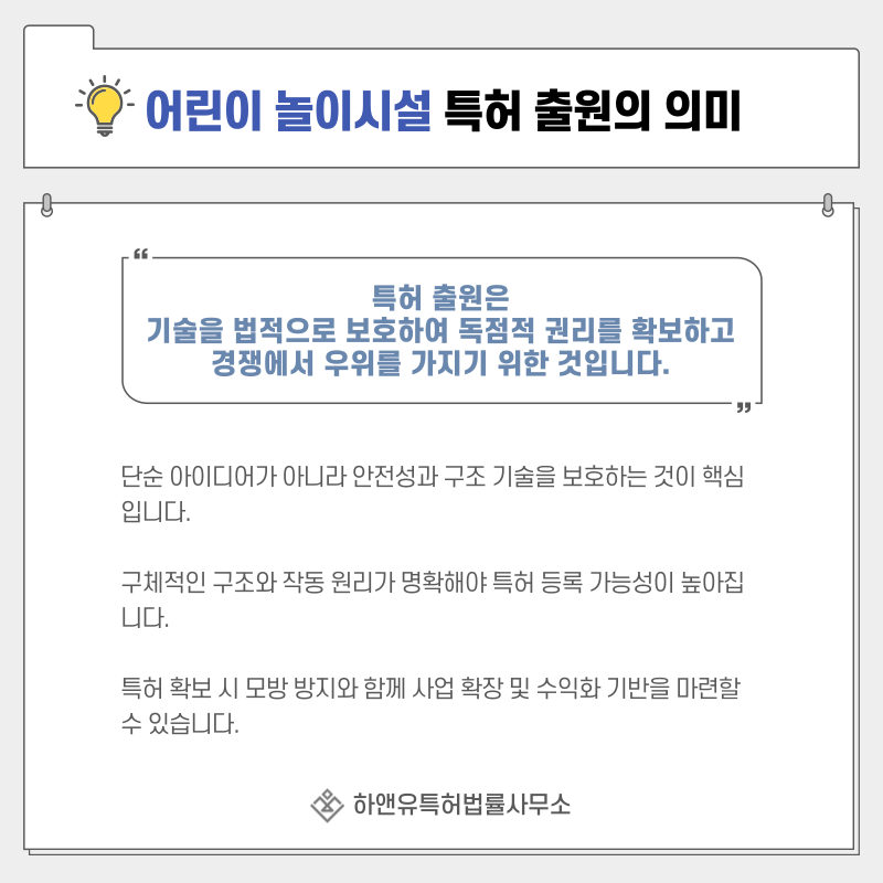 특히 놀이시설은 설치형 제품 특성상 모방이 빠르게 확산될 수 있기 때문에 사전 권리 확보가 중요합니다.