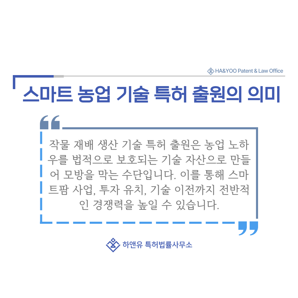 1. 스마트 농업 기술, 작물 재배 생산 기술, 정식, 파종 장치, 토양개량제, 관수/관비 시스템 특허 출원의 의미