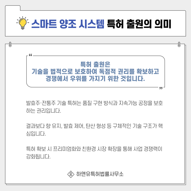특허를 확보하면 동일한 발효주나 전통주 시장에서도 차별화된 기술력을 기반으로 경쟁 우위를 확보할 수 있습니다.