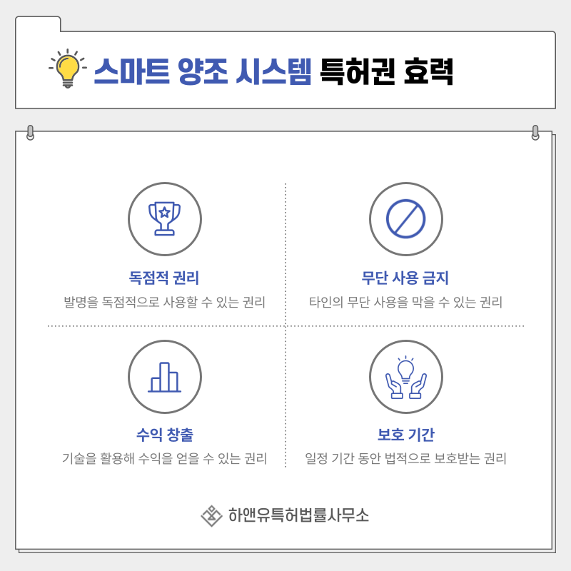 등록 이후에는 해당 기술에 대한 독점적 권리를 확보하게 되며 무단 사용에 대한 법적 대응이 가능합니다.
