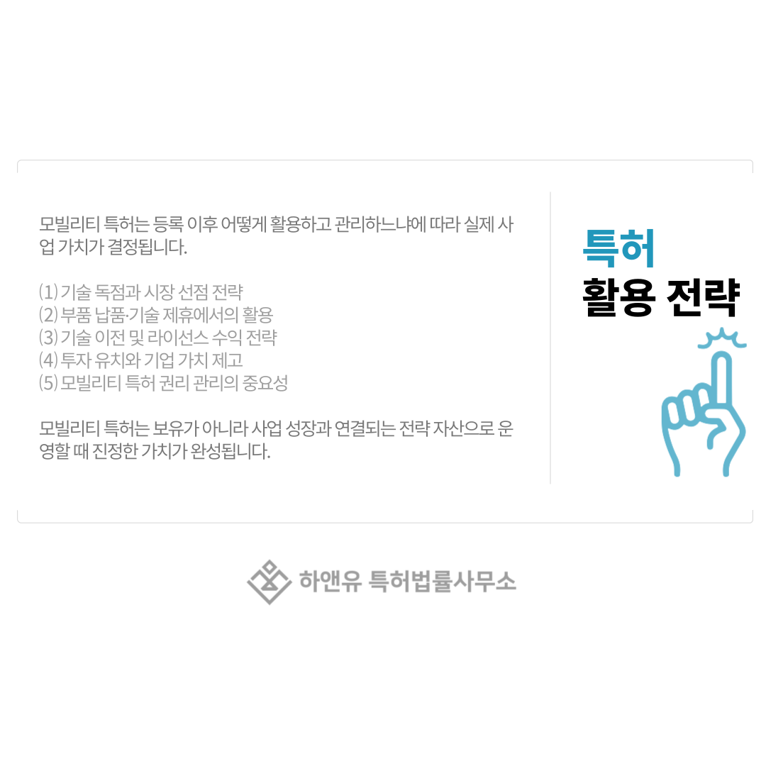 아래에서 모빌리티 특허를 등록한 이후 반드시 고려해야 할 활용 전략과 권리 관리 포인트를 정리해 보겠습니다.