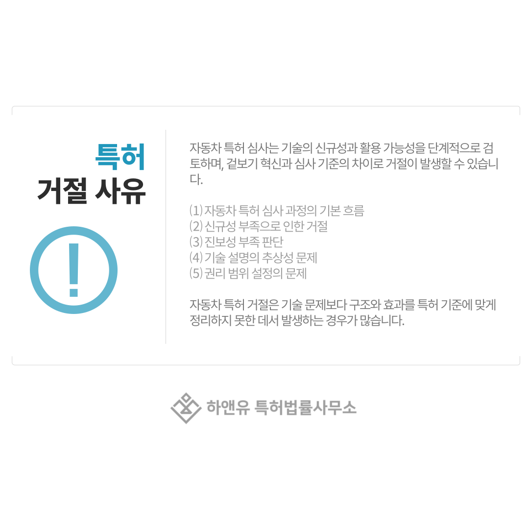 아래에서 자동차 특허 심사 과정과 함께, 거절이 자주 발생하는 핵심 이유를 정리해 보겠습니다.