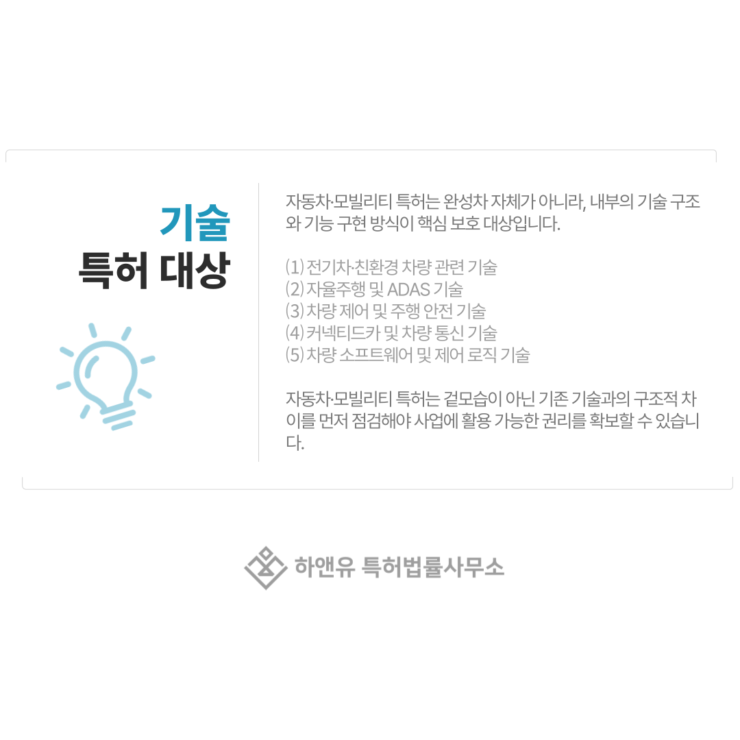 자동차·모빌리티 기술 특허 대상은 완성차 전체가 아니라, 그 안에서 작동하는 기술 구조와 기능 구현 방식입니다.