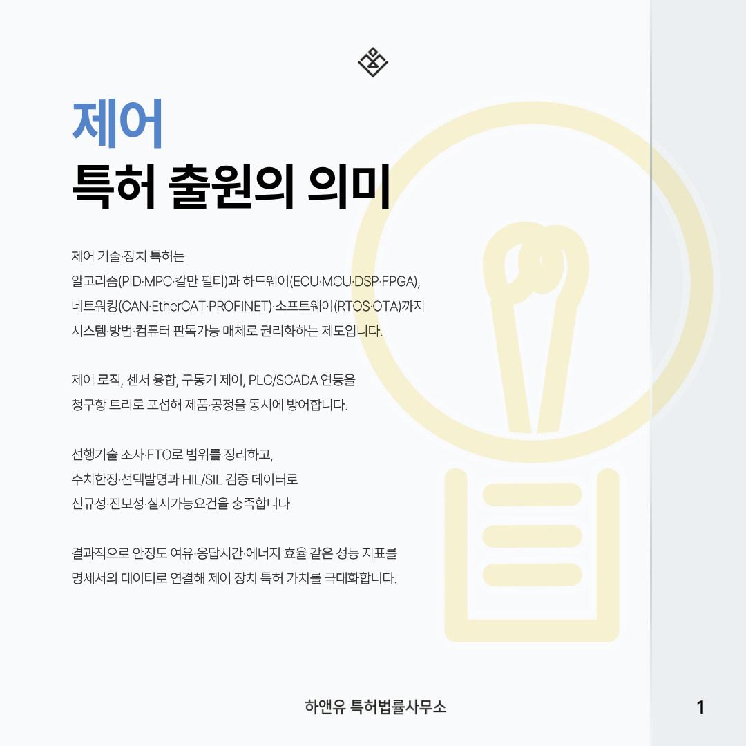 #하앤유특허법률사무소 #제어기술특허 #제어장치특허 #특허출원 #명세서작성 #청구항전략 #FTO #MPC #PID #RTOS #ISO26262 #HILSIL #라이선스 #IP전략 #맞춤형컨설팅