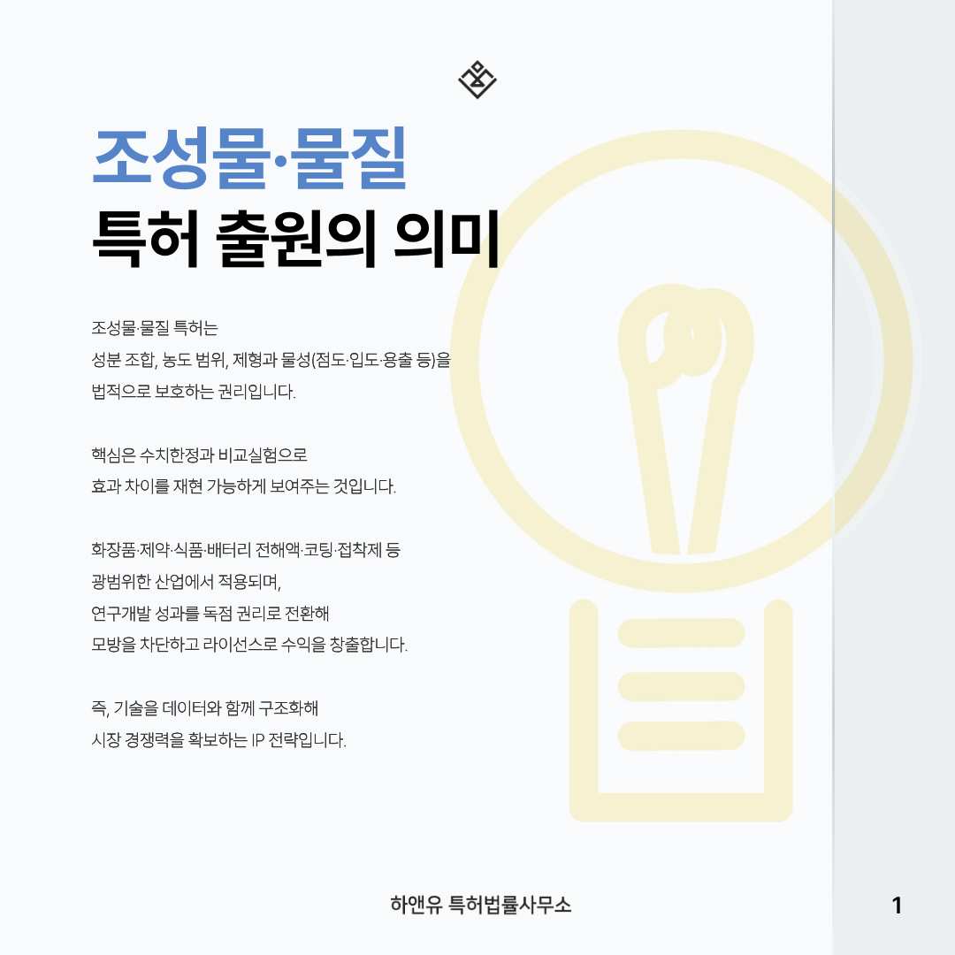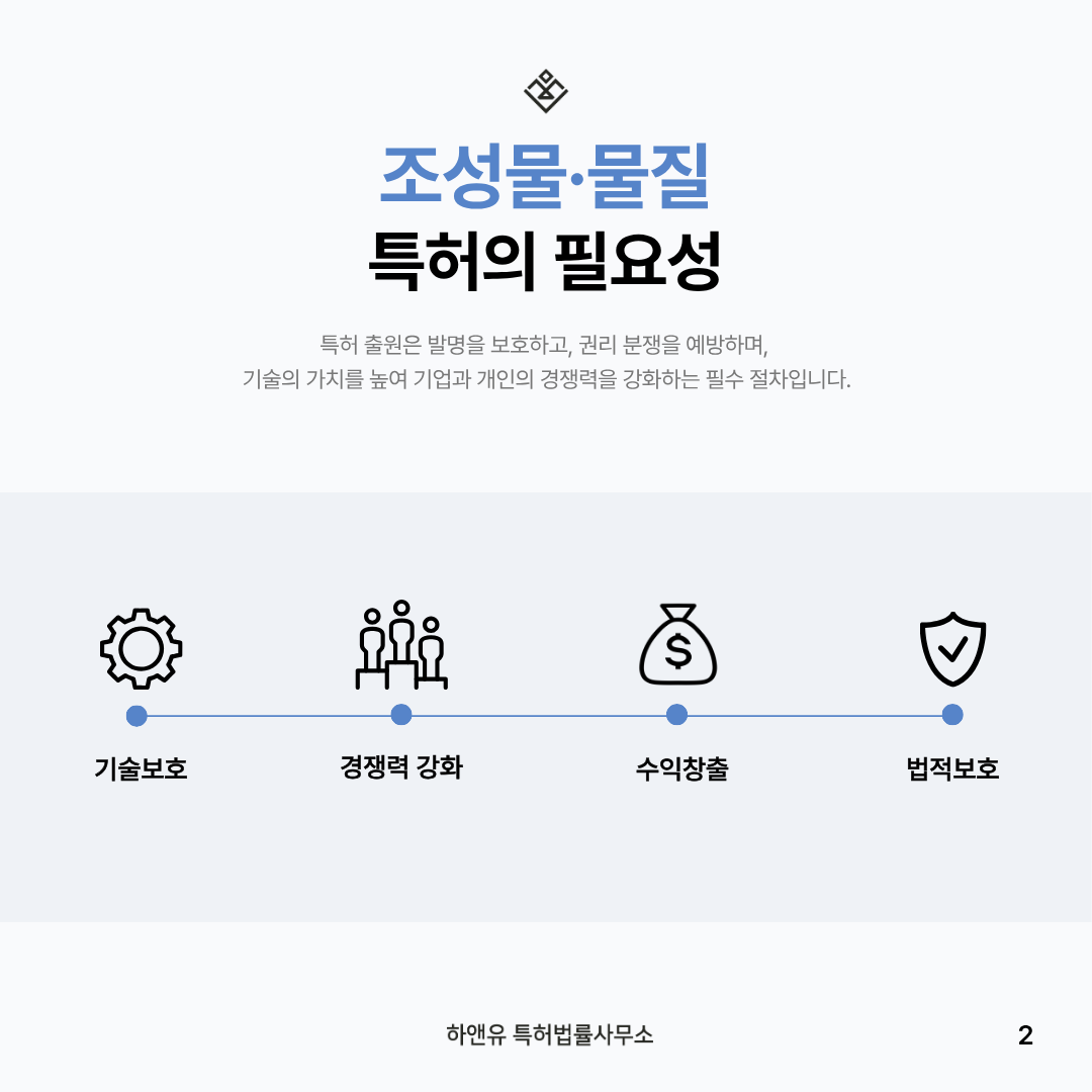 #하앤유특허법률사무소 #조성물특허 #물질특허 #특허출원 #명세서작성 #선행기술조사 #IP전략 #맞춤형컨설팅