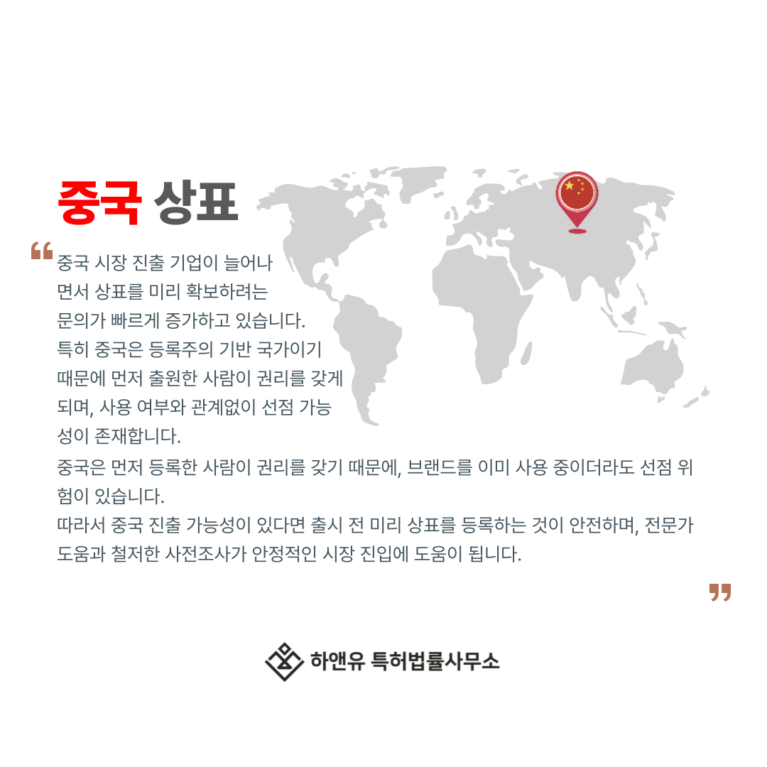 특히 중국 시장은 브랜드 모방과 선점 출원이 비교적 빈번하게 발생하는 국가이기 때문에, 진출 예정 여부와 관계없이 브랜드를 보유한 기업이라면 미리 상표를 등록해두는 것이 매우 중요합니다.