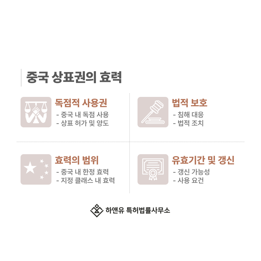 중국 상표권은 지정상품 또는 서비스 범위를 기준으로 효력이 적용됩니다.