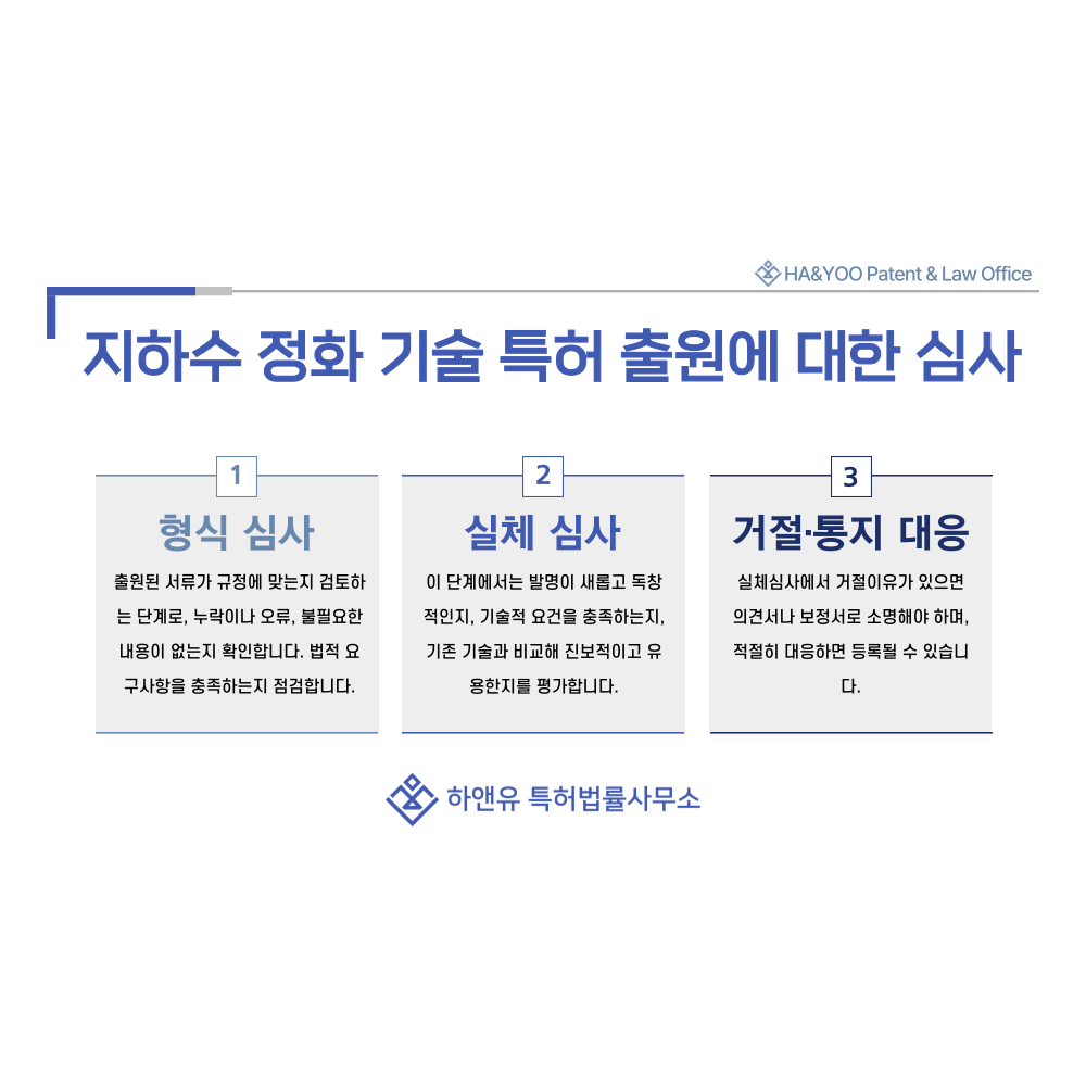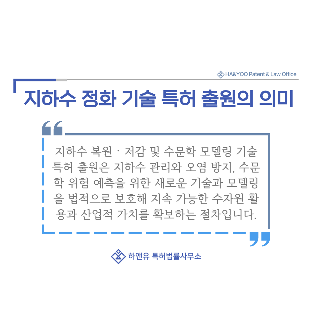 이처럼 지하수 복원·저감 및 수문학 모델링 기술 특허 출원은 지하수 관리와 환경 보호를 동시에 실현할 수 있는 기술적 차별성을 보호하고, 지속 가능한 수자원 활용과 관련 산업적 가치를 법적으로 확보할 수 있는 중요한 절차입니다.