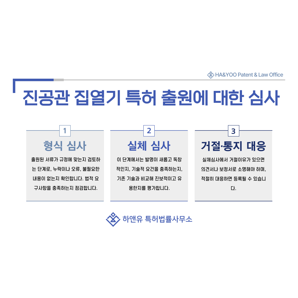 출원된 진공관 집열기 기술이 신규성과 진보성, 산업적 이용 가능성을 충족하는지 실질적으로 심사합니다. 심사 과정에서 거절 이유가 통지될 경우, 기술적 설명을 보강하거나 청구항을 수정하는 보정 대응을 통해 거절 사유를 해결해야 합니다. 이 단계에서 충분한 대응을 통해 등록 가능성을 높이는 것이 중요합니다.