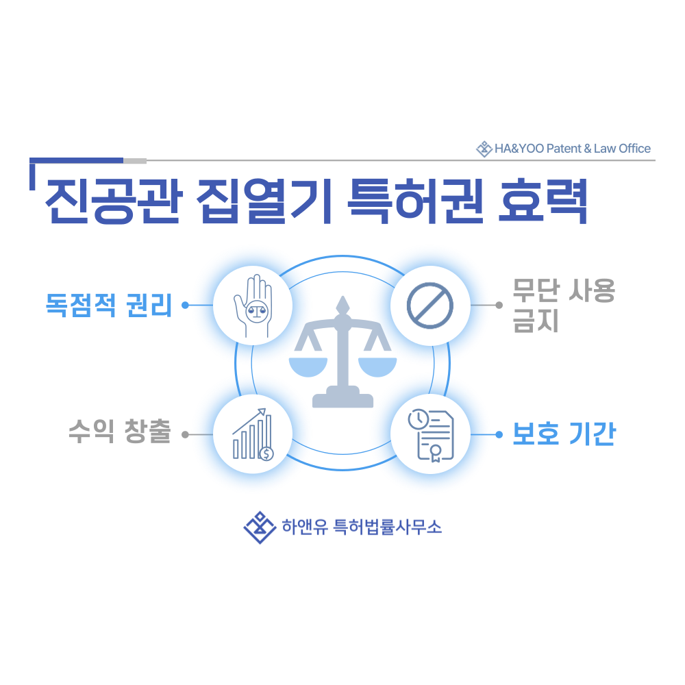 등록된 특허권자는 진공관 집열기 기술에 대해 독점적으로 권리를 행사할 수 있습니다. 즉, 다른 사람이 동일하거나 유사한 기술을 제조, 사용, 판매, 수입하는 것을 제한할 수 있으며, 기술을 독자적으로 활용하여 경쟁사와 차별화된 시장 지위를 확보할 수 있습니다. 이를 통해 기술적 우위와 시장 내 경쟁력을 강화할 수 있습니다.