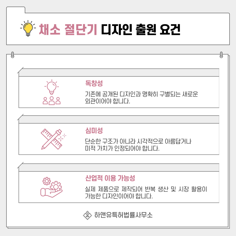 3. 채소절단기, 푸드프로세서, 채칼, 분쇄기, 슬라이서, 커터기, 채절기 디자인 출원 및 등록 요건