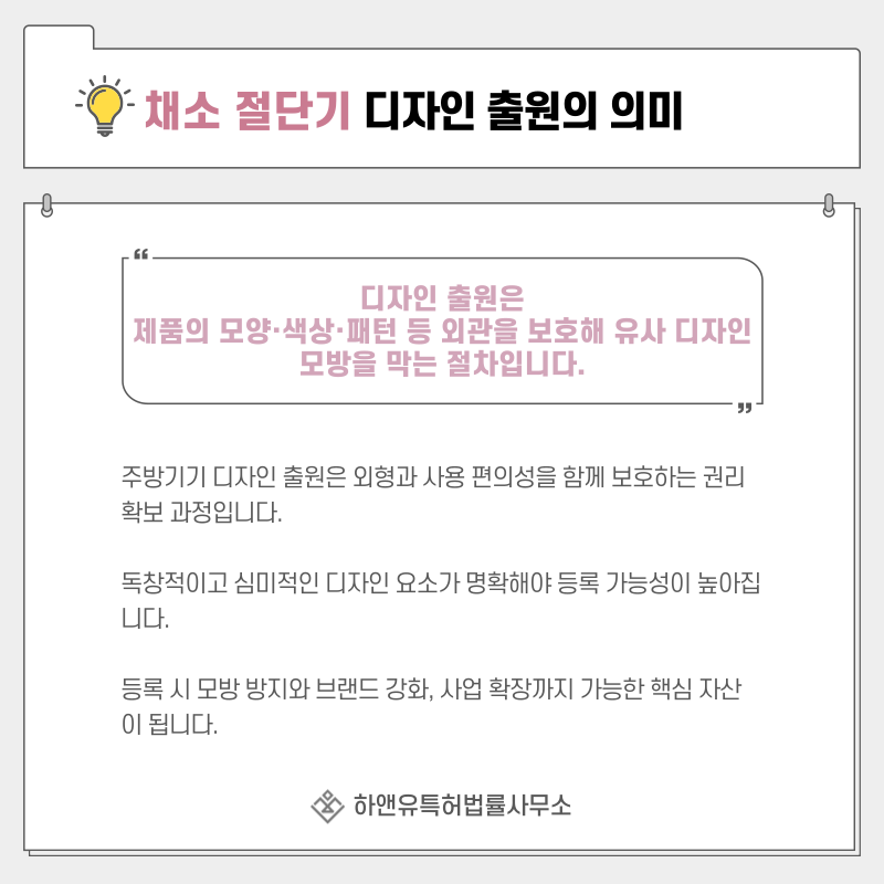 특히 주방기기처럼 외형 유사성이 높은 시장에서는 디자인권이 중요한 방어 수단이 됩니다.