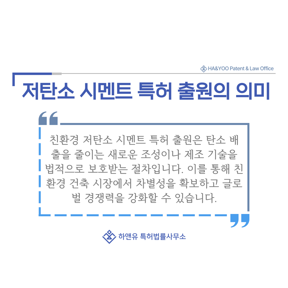 시멘트 산업은 친환경 전환이 필수적인 분야이므로, 저탄소 기술을 특허화하면 기업의 경쟁력이 크게 높아집니다. 특허권을 보유하면 단순히 제품 성능만이 아니라, 기술적 신뢰성을 입증하는 수단이 되어 발주처나 투자자에게 유리하게 작용합니다. 또한 글로벌 시장에서 탄소 저감 기술에 대한 수요가 증가하고 있어, 특허를 통한 차별화는 곧 경쟁 우위로 이어집니다.