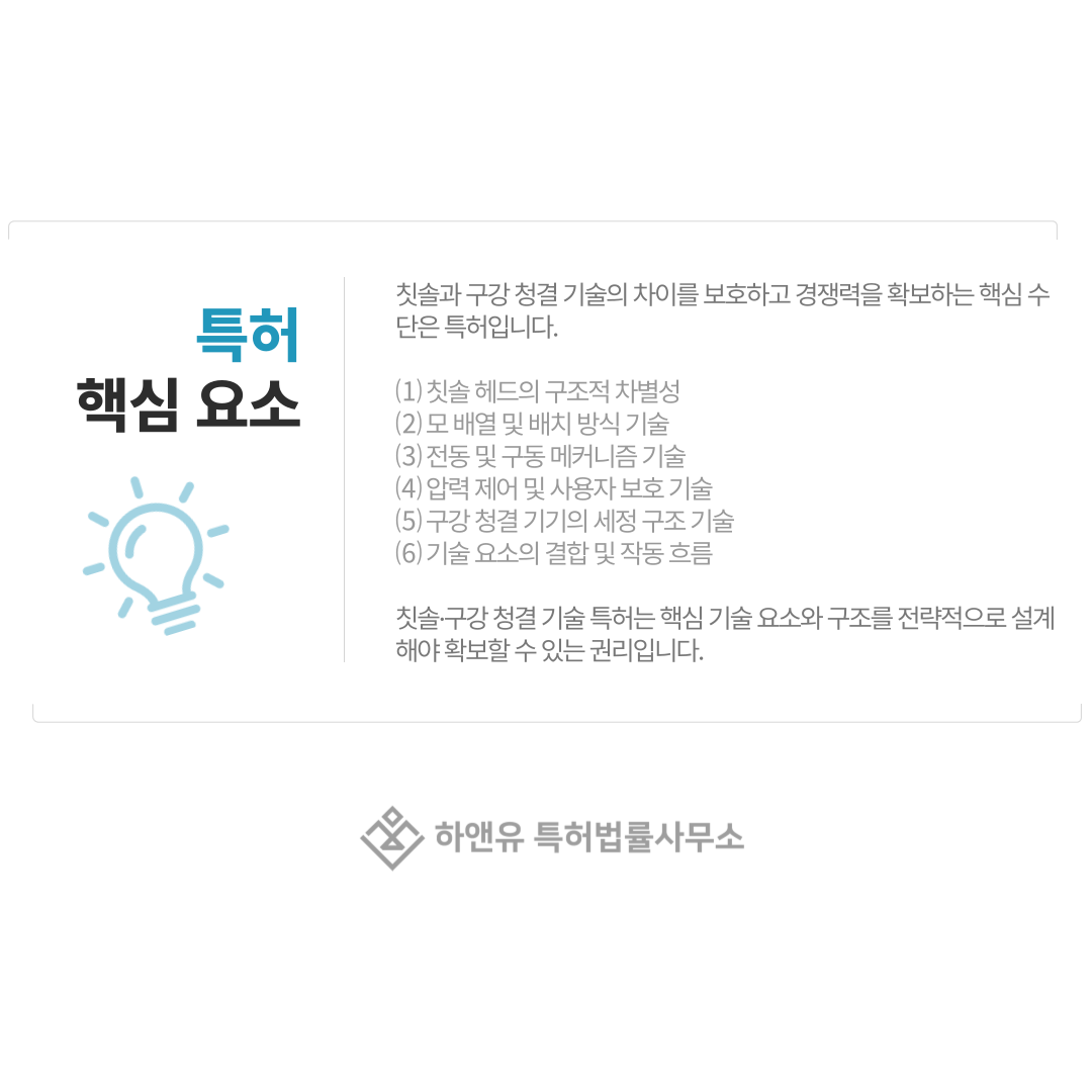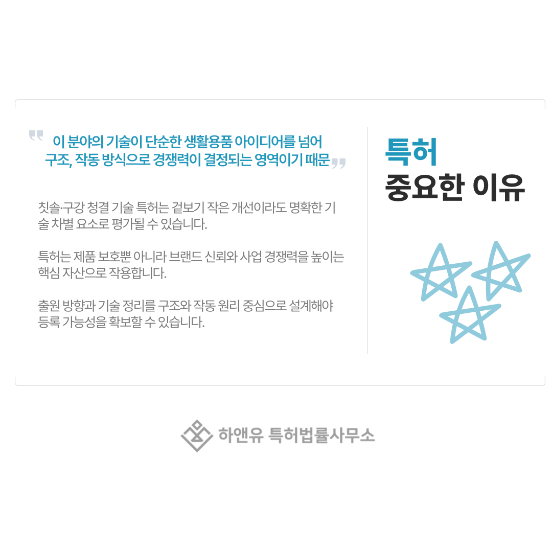 칫솔과 구강 청결 기술은 작은 구조 차이나 기능 개선만으로도 특허 보호가 가능합니다.