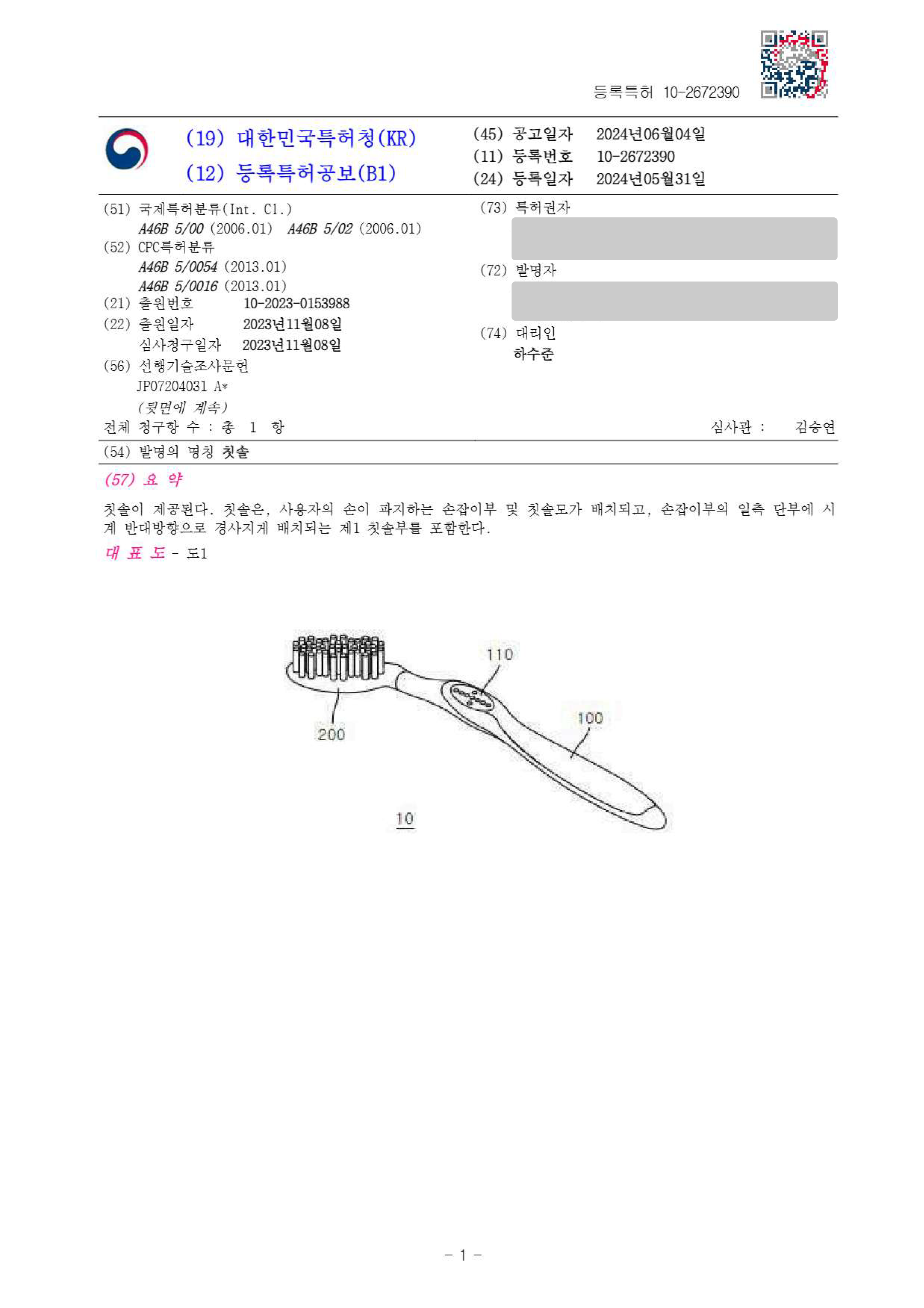 하앤유특허법률사무소를 통해 출원 등록된 칫솔·구강 청결 기술 등록사례입니다.