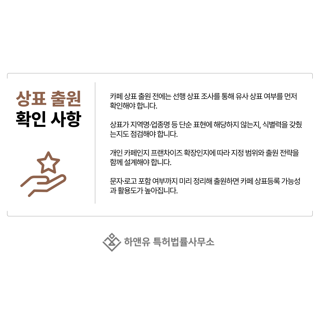 출원 전에 이러한 사항을 충분히 점검하는 것이 카페 상표등록의 첫 단계입니다.