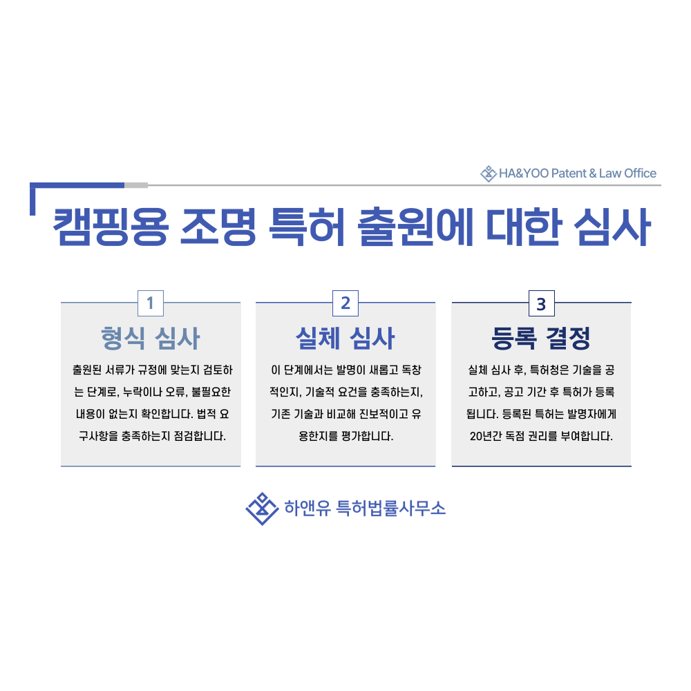 캠핑용 조명, 랜턴, 헤드램프, 스트링라이트, 파워뱅크 기술의 특허 출원은 먼저 서류의 형식적 요건을 검토하는 형식심사를 거칩니다.