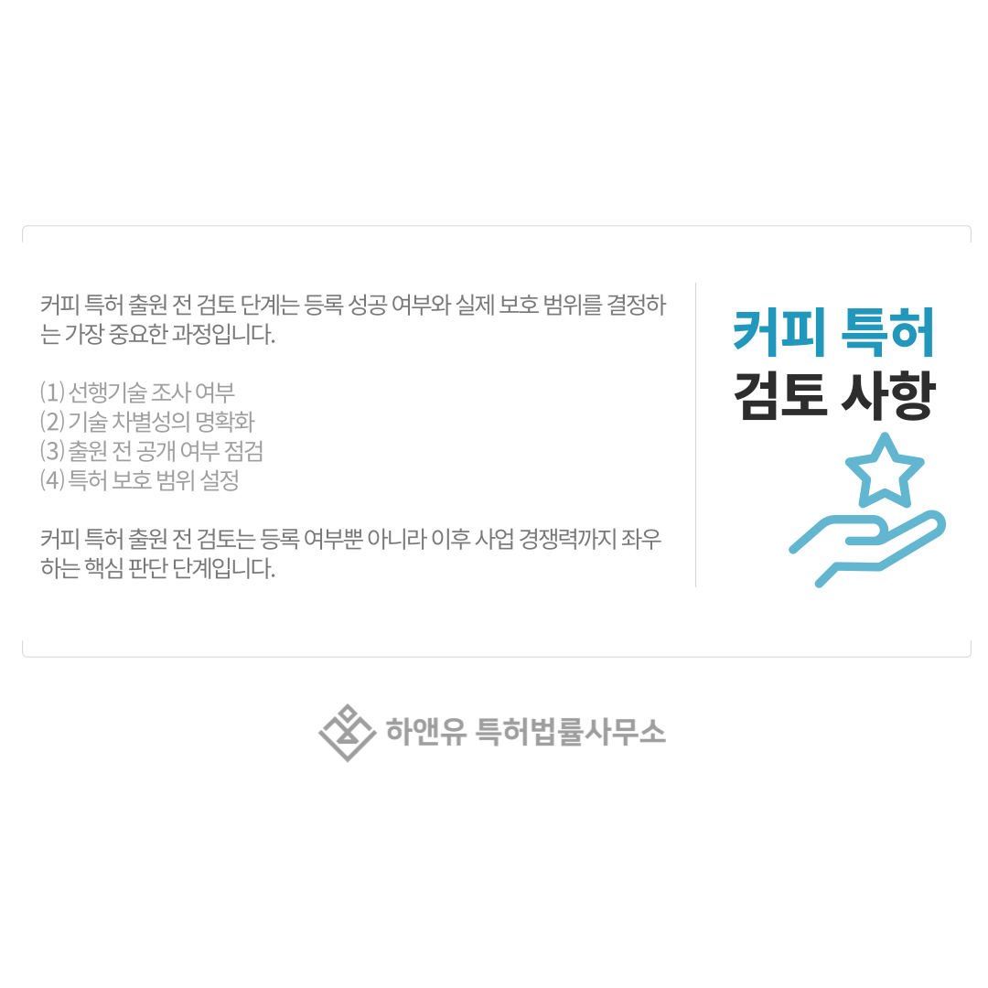 커피 특허 출원 전 반드시 검토해야 할 사항은 등록 가능성과 권리 활용 범위를 좌우하는 핵심 단계입니다.