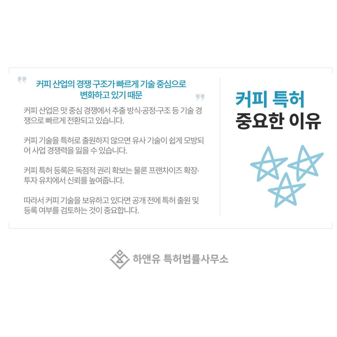 #커피특허 #커피특허출원 #커피특허등록 #식품특허 #커피기술 #커피사업 #지식재산 #특허출원 #특허등록 #특허권 #PatentRegistration #PatentApplication #특허사무소 #특허법률사무소 #하앤유특허법률사무소