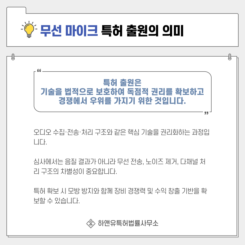단순한 음향기기 아이디어를 보호하는 것이 아니라 오디오 수집·전송·처리 구조를 기술로서 권리화하는 과정입니다.